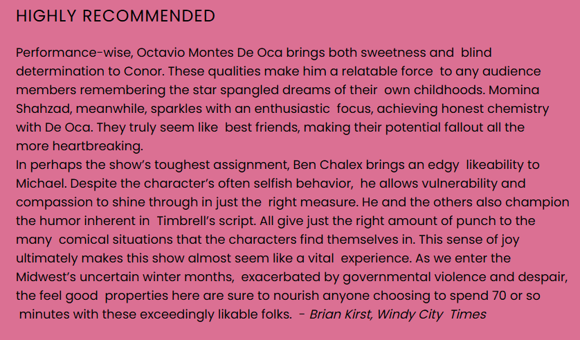 Open Space Arts proudly continues its momentum of introducing Chicago audiences to powerful new queer stories with another American premiere—building on our Jeff Award–recognized tradition of bold, contemporary, boundary-pushing theatre. In our intimate 25-seat storefront space, innovative new work comes to life just inches from the audience, creating an immediacy and emotional impact that few venues can replicate.