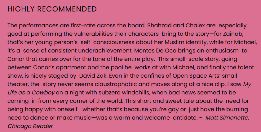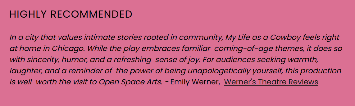 With My Life as a Cowboy, OSA once again brings an exciting international voice to the city, championing playwrights whose stories radiate humor, heart, and the complexity of queer identity. This production continues our mission to uplift new playwrights, celebrate queer joy, and offer Chicago fresh, adventurous theatre that can’t be found anywhere else.